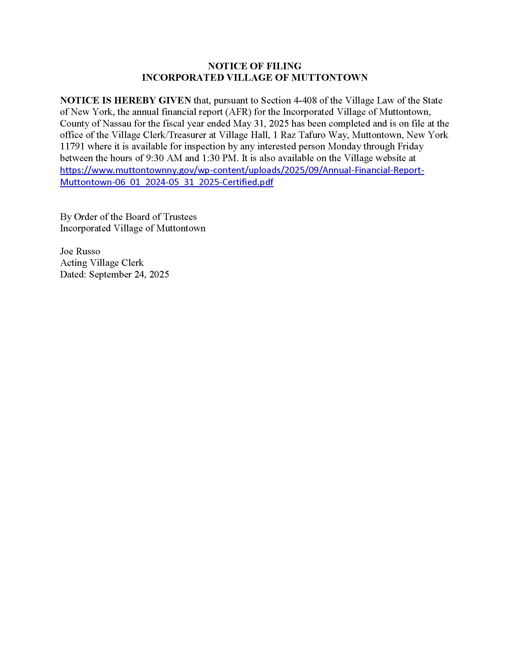 NOTICE IS HEREBY GIVEN that, pursuant to Section 4-408 of the Village Law of the State of New York, the annual financial report (AUD) for the Incorporated Village of Muttontown, County of Nassau for the fiscal year ended May 31, 2021 has been completed and is on file at the office of the Village Clerk/Treasurer at Village Hall, 1 Raz Tafuro Way, Muttontown, New York 11791 where it is available for inspection by any interested person Monday through Friday between the hours of 9:30 AM and 1:30 PM. It is also available on the Village website at https://www.muttontownny.gov/wp-content/uploads/2021/10/AUD-Final.pdf