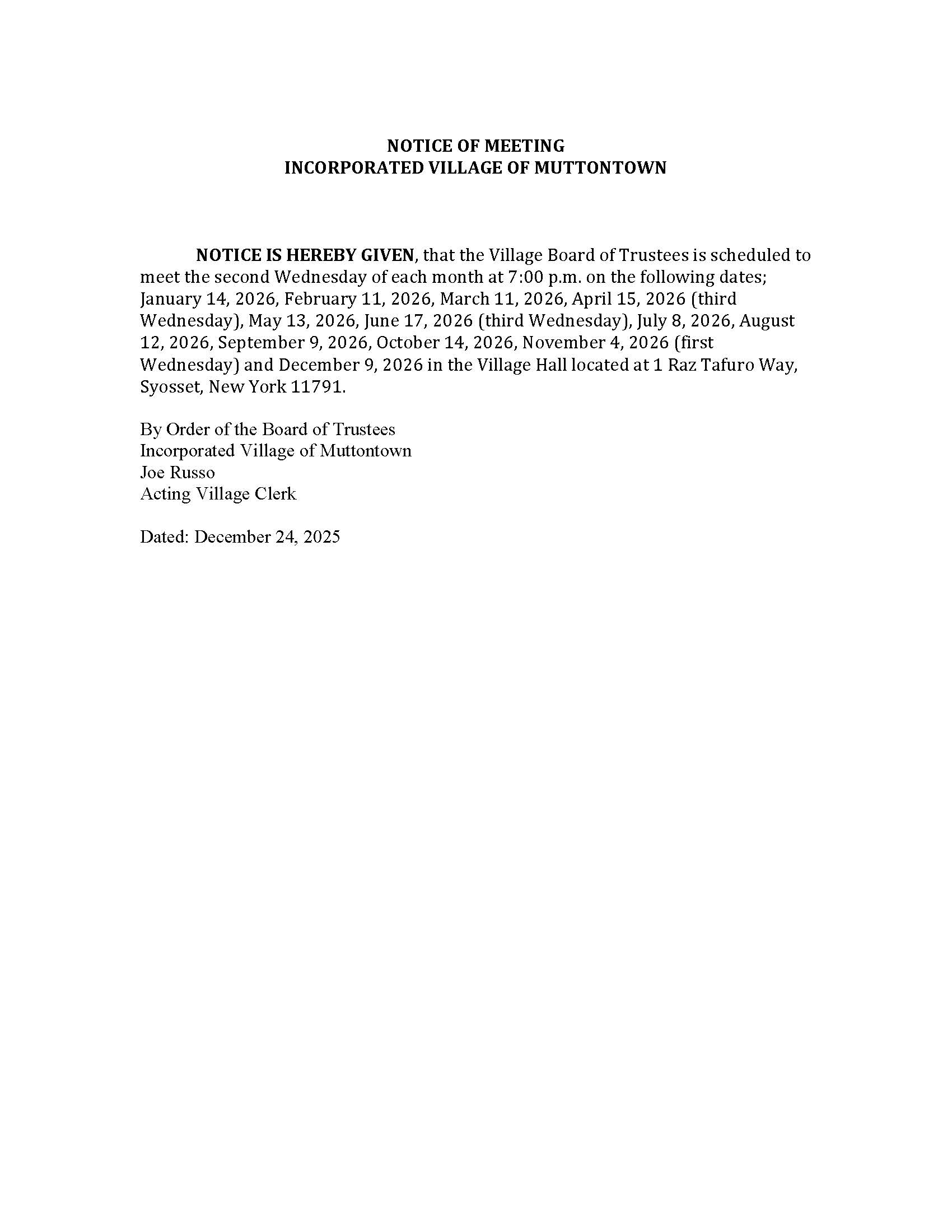 TO AMEND §62-2 OF THE VILLAGE CODE OF THE INCORPORATED VILLAGE OF MUTTONTOWN